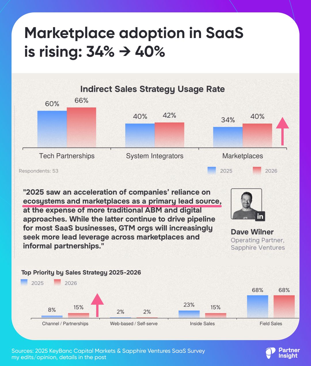Marketplace adoption as an indirect sales strategy in SaaS is climbing from 34% to 40% - while reliance on tech partners is also rising.