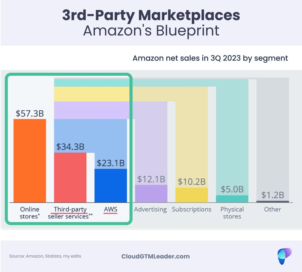 Amazon's model offers a blueprint on how scaling a 3rd party marketplace plays out. In e-commerce, 3rd-party sellers are now ~60% of Amazon's direct revenue, growing at 3X rate that of their own e-commerce (18% vs 6%).