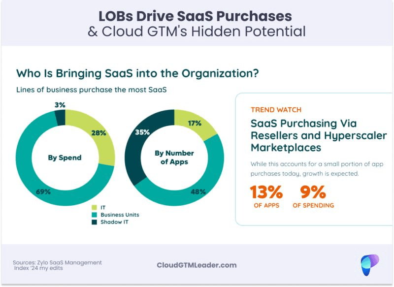 The newly released Zylo SaaS Management Index '24 unveiled that 13% of SaaS apps are bought via cloud marketplaces (AWS, Google Cloud, Azure) or via resellers (CDW, etc.). This highlights the early stage of Cloud GTM with anticipated growth.
