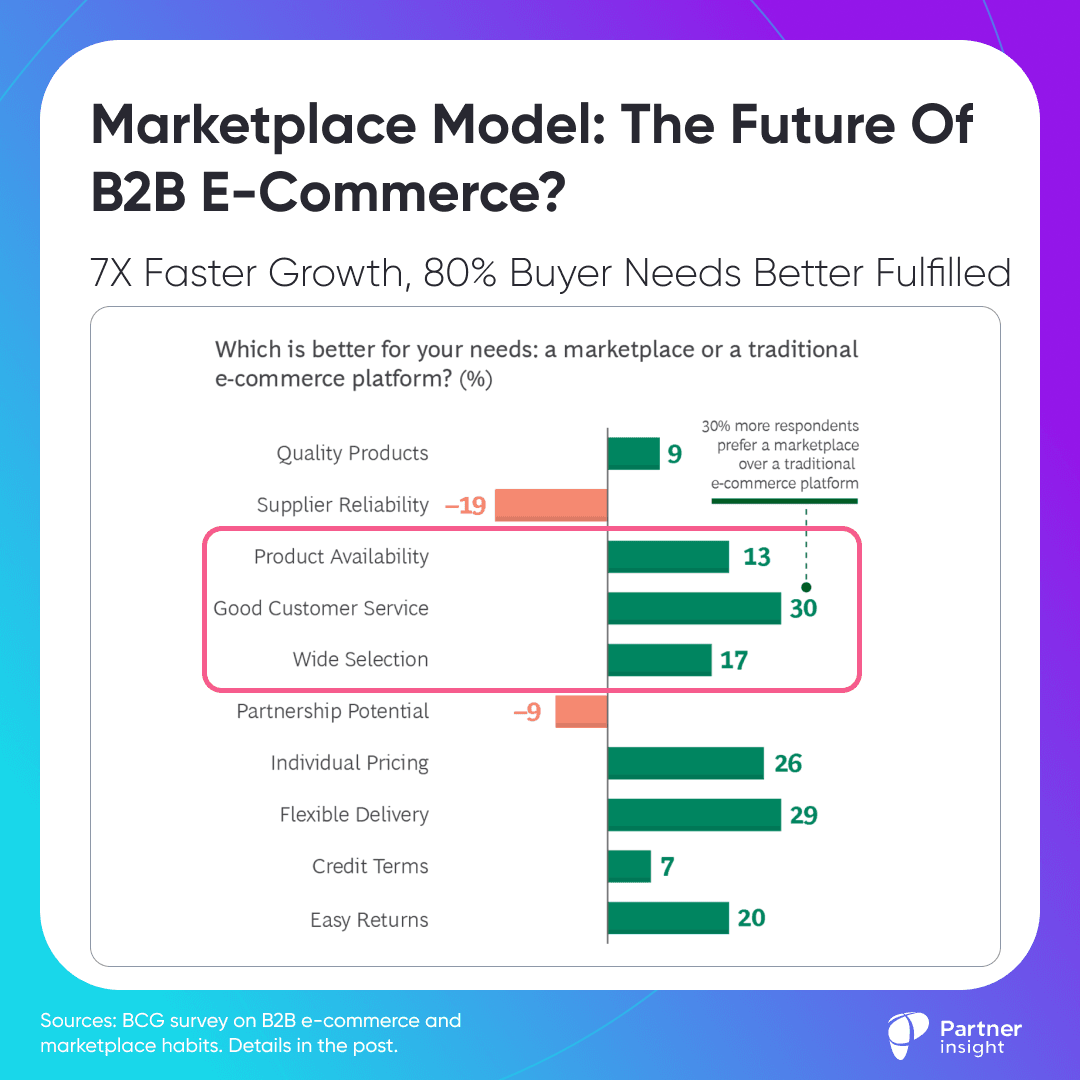 B2B buyers prefer the marketplace model, because 8 out of 10 of their most important needs are fulfilled better through marketplaces than traditional e-commerce sites (see the image). This drives much faster growth of marketplaces than traditional e-commerce, which is growing fast in itself.