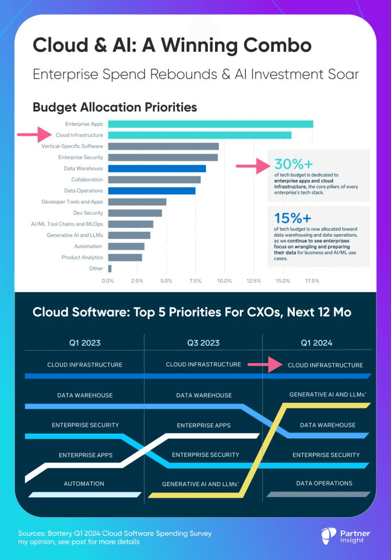 Cloud infrastructure remains the 💳 top spending priority for enterprises, with AI quickly climbing the ranks and challenging traditional enterprise applications.