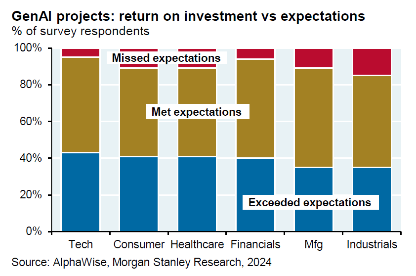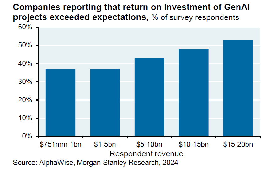 Morgan Stanley's latest survey (3Q24) shows 70% of CIOs expect AI in production by 2025, with ~38% already having it in production in 2024. This puts AI adoption on pace to significantly outstrip both internet and computer adoption curves.