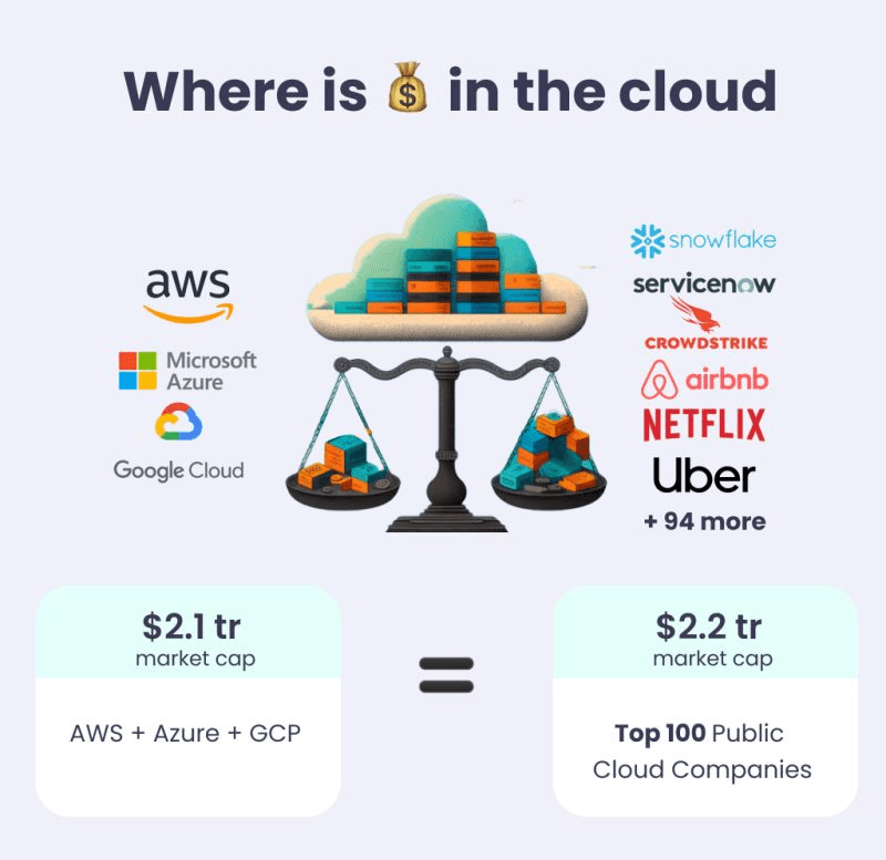 If you take the 100 publicly traded cloud companies, both B2B and B2C, and you put their market caps together, you get roughly the same amount. This includes companies like Uber, Netflix, Airbnb, Snowflake, ServiceNow, CrowdStrike, etc..