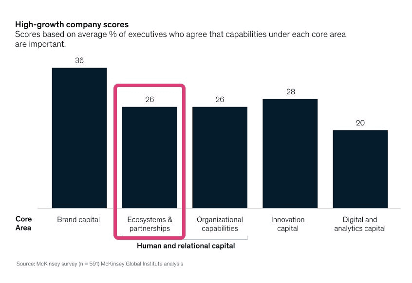 According to the same McKinsey research, executives put the importance of partnerships on par with human capital and following the brand and ability to innovate.