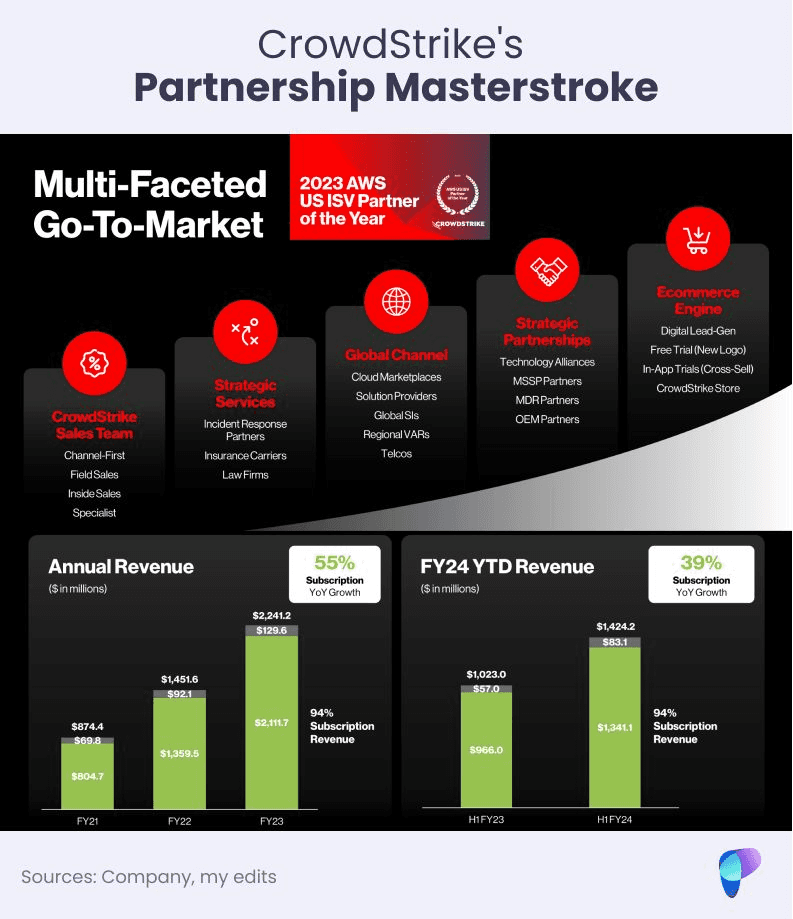 CrowdStrike has been also making waves with its Amazon Web Services (AWS) marketplace-first strategy. They won AWS's ISV US Partner of the 2023 award and are the largest cybersecurity GTM partner for AWS.