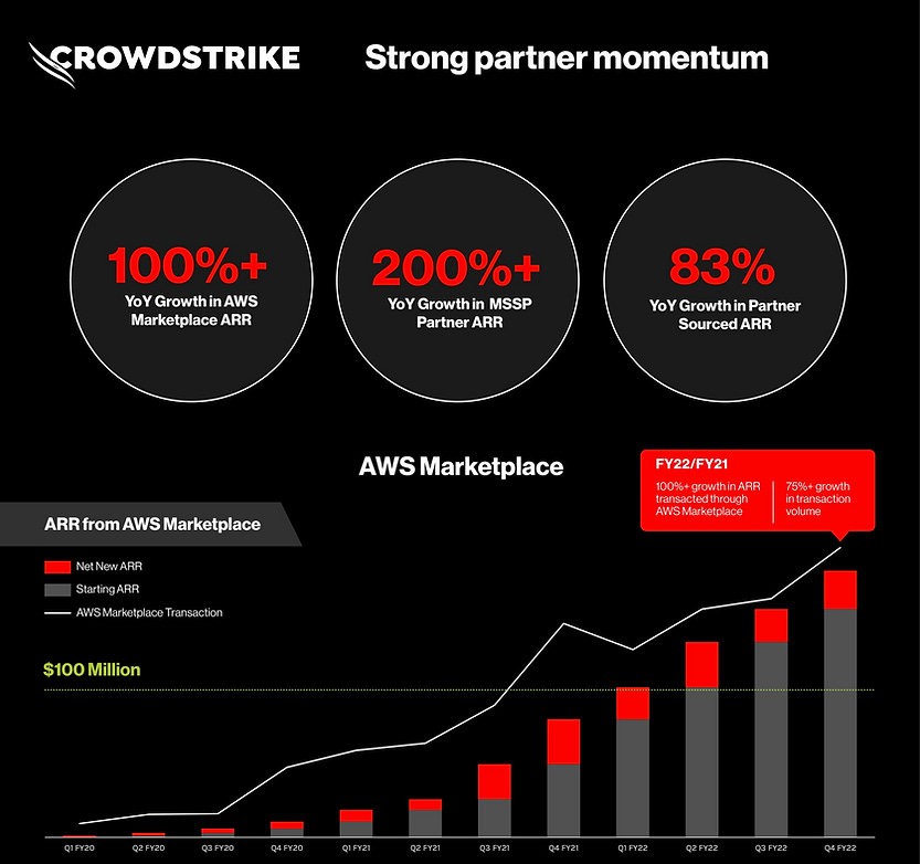 CrowdStrike platform Falcon is also available in the AWS Marketplace, which allows AWS customers to easily purchase and scale their consumption with pay-as-you-go pricing. CrowdStrike was one of top ISV partners by transaction volume on the AWS Marketplace in In FY22 with transacted ARR through the AWS marketplace growing +100% YoY.