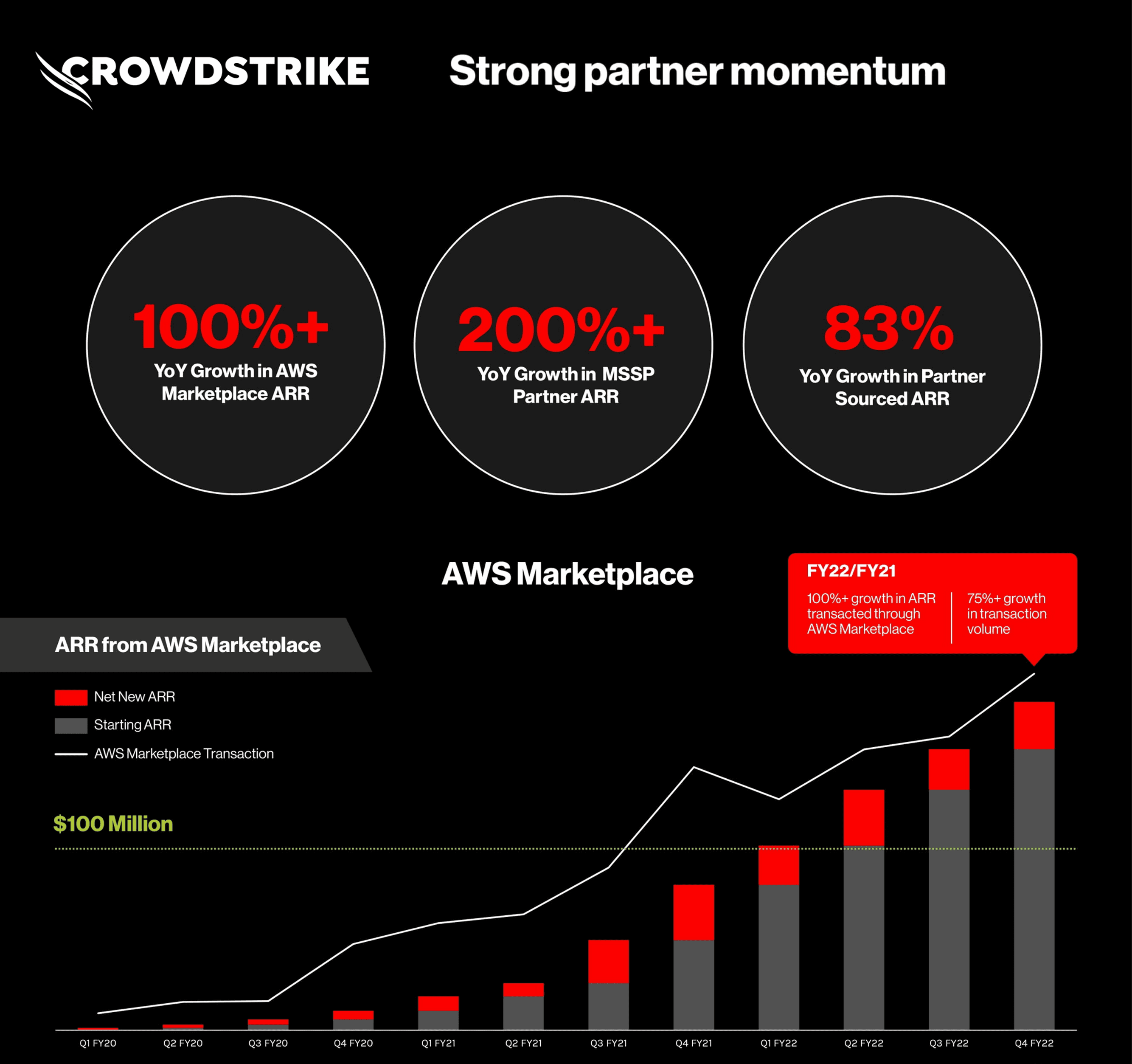 CrowdStrike platform Falcon is also available in the AWS Marketplace, which allows AWS customers to easily purchase and scale their consumption with pay-as-you-go pricing. CrowdStrike was one of top ISV partners by transaction volume on the AWS Marketplace in In FY22 with transacted ARR through the AWS marketplace growing +100% YoY.