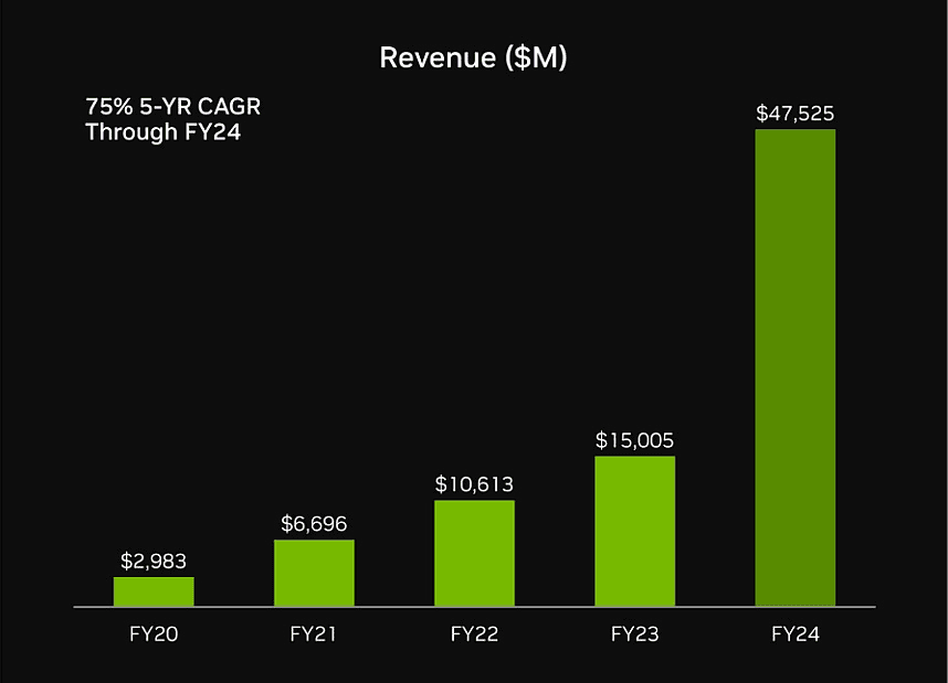 Data Center grew 3X from the previous year reaching $47.5Bn in revenue in FY24 and now contributing 78% to the total annual revenue.