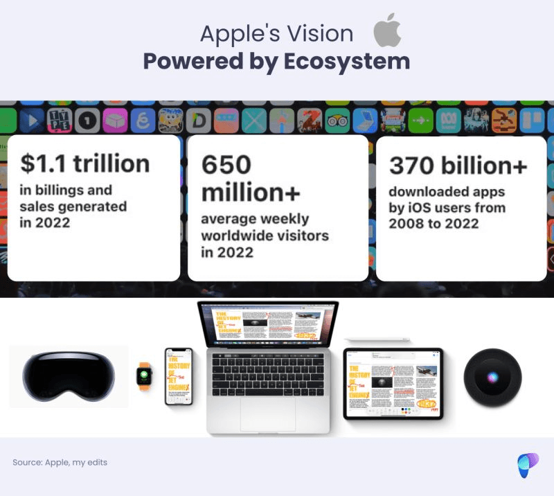Apple is tapping into its App Store ecosystem 🎯, which generated $1.1 trillion in sales in 2022. The ecosystem that will help to drive the AR/VR market r/evolution.