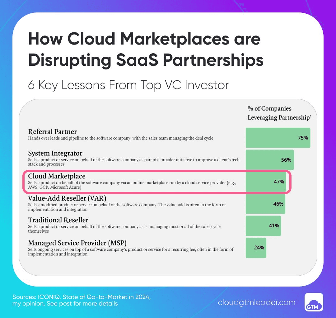 A recent ICONIQ Capital study on SaaS GTM 2024 reveals that a staggering 47% of software companies are using marketplaces of Amazon Web Services (AWS), Microsoft Azure, and Google Cloud.