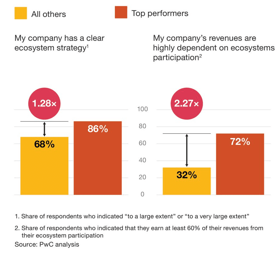 In today's market, top-performing companies heavily rely on ecosystems for revenues. Ecosystems are what help them outperform competition. This is a key insight from PwC's recent research of 2,000+ decision-makers globally.