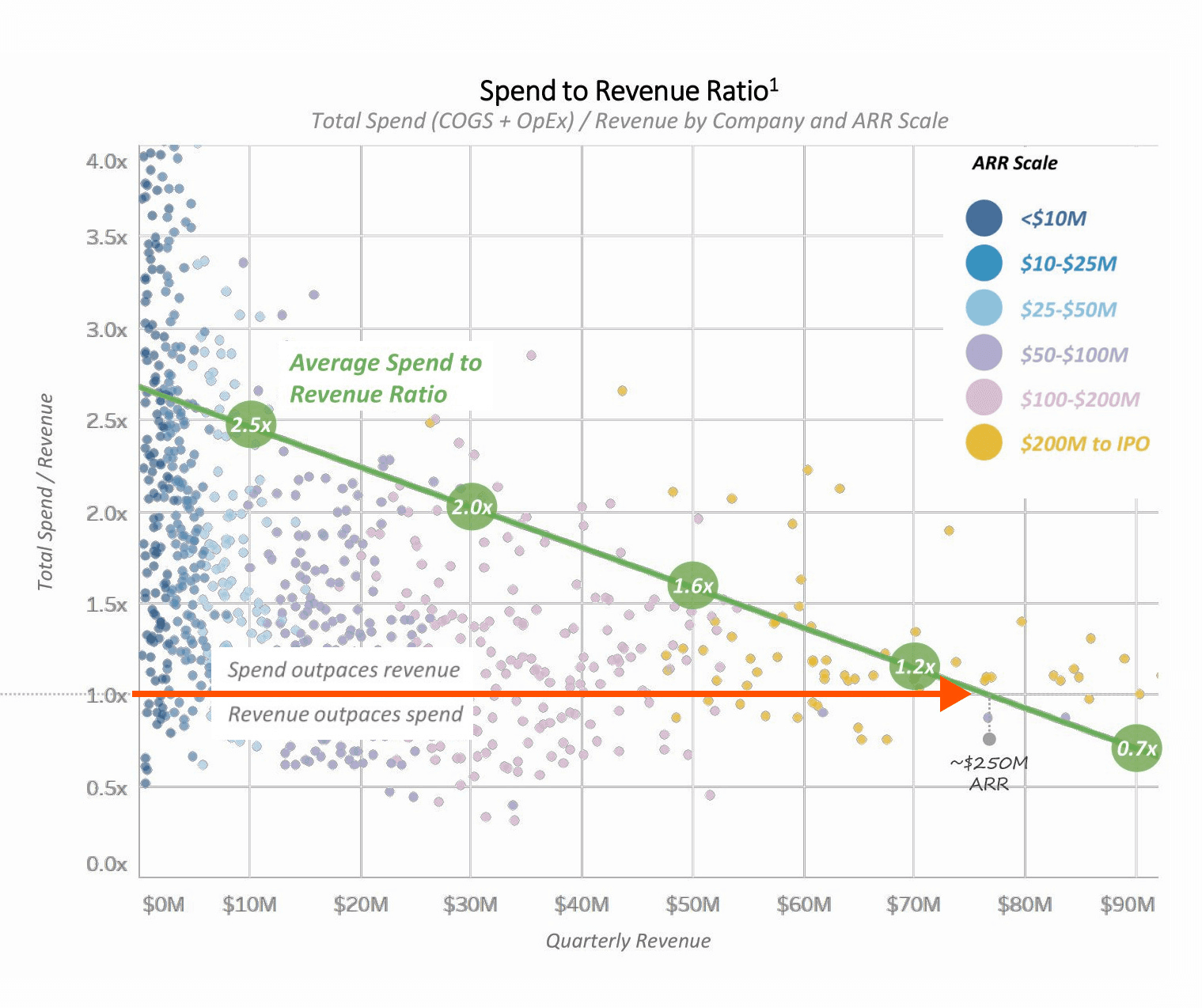The spend/revenue ratio on the graph above by ICONIQ Capital shows that businesses need to push this ratio to 1 and below to scale.