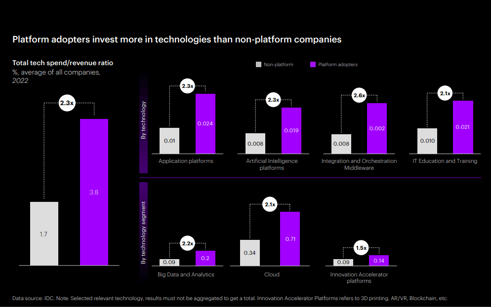 Platform companies invest more than 2X as much in technology, such as cloud and AI, and 2.6X more in integration and orchestration middleware.