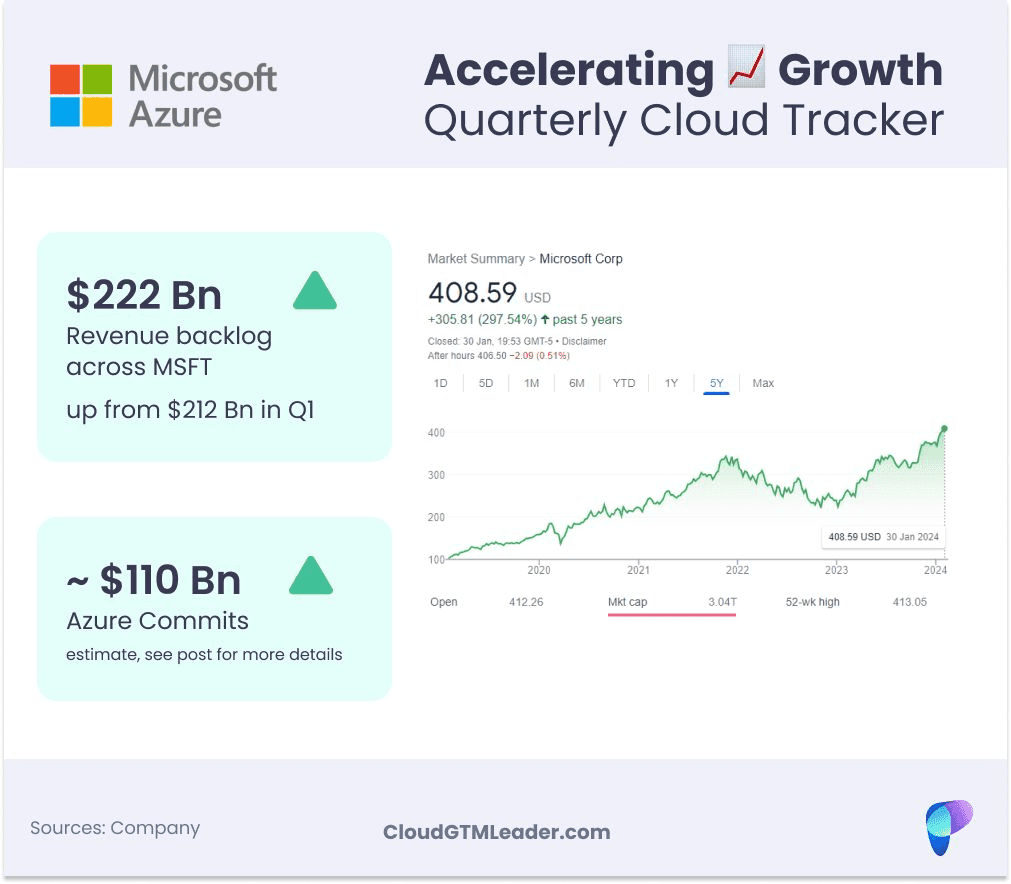 While Microsoft only discloses total commits for all its cloud services, a rough estimation suggests that half of the $222 billion in commits are related to Azure. This estimation aligns with Nadella’s statement from July: "Microsoft Cloud surpassing $110 billion in annual revenue… with Azure accounting for over 50% of the total for the first time." Consequently, we can infer Azure's cloud commits to be in excess of $110 billion.