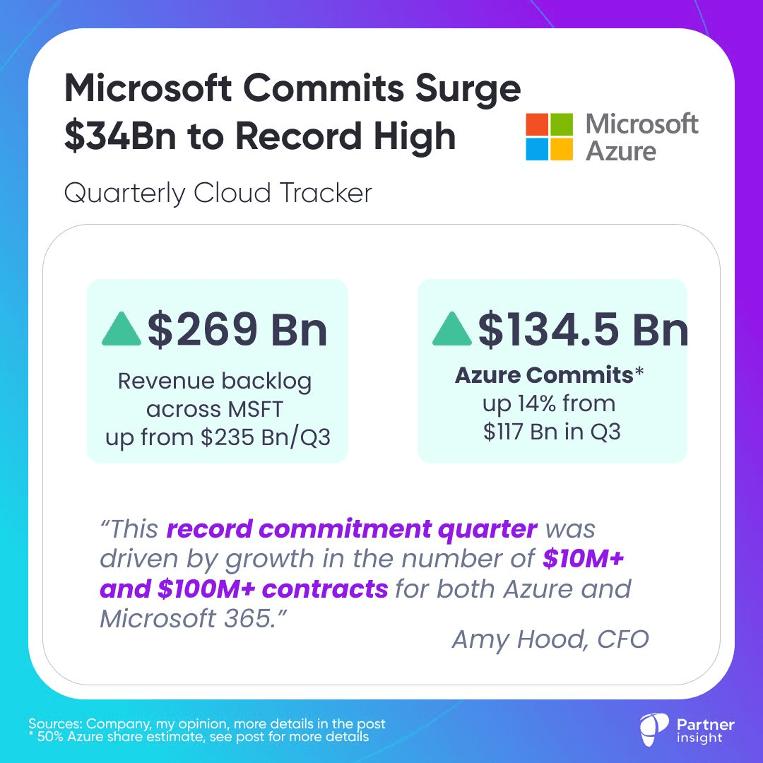 Microsoft's current commercial revenue backlog stands at $269Bn, up from $235Bn in Q3. This pegs Azure commits at ~$134.5Bn (~50% share).