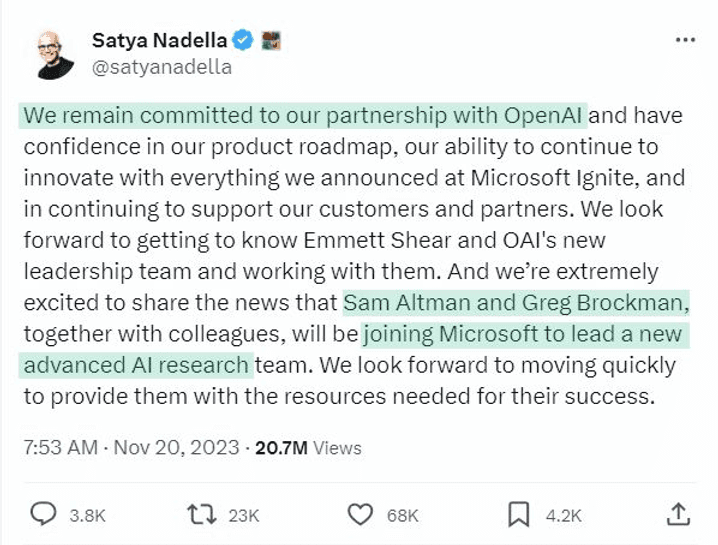 The internal discord at OpenAI concerning Altman's ousting seemed to create a rift, but Microsoft is skillfully trying to close this gap. Incorporating Altman, Brockman (and others from Open AI if they decide to join), Microsoft is poised to potentially expedite its AI projects.