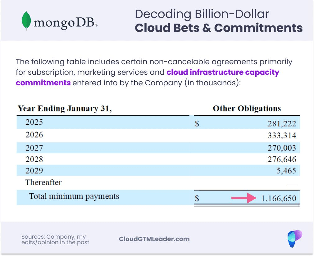 Earlier this year, MongoDB disclosed it has over $1B in commitments to "subscriptions, marketing services, and cloud infrastructure capacity." While these cloud commitments are bundled with other services, it’s fairly obvious that they constitute the majority of this $1.16Bn.