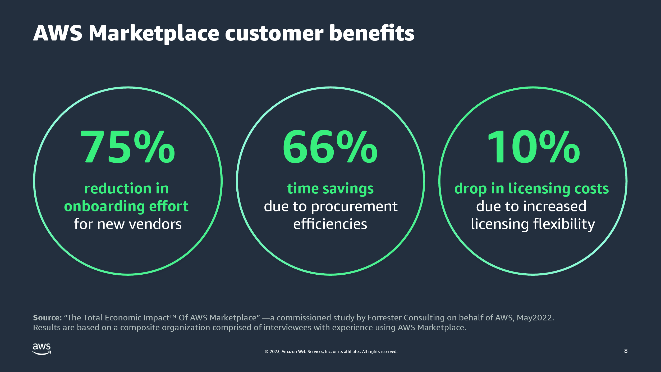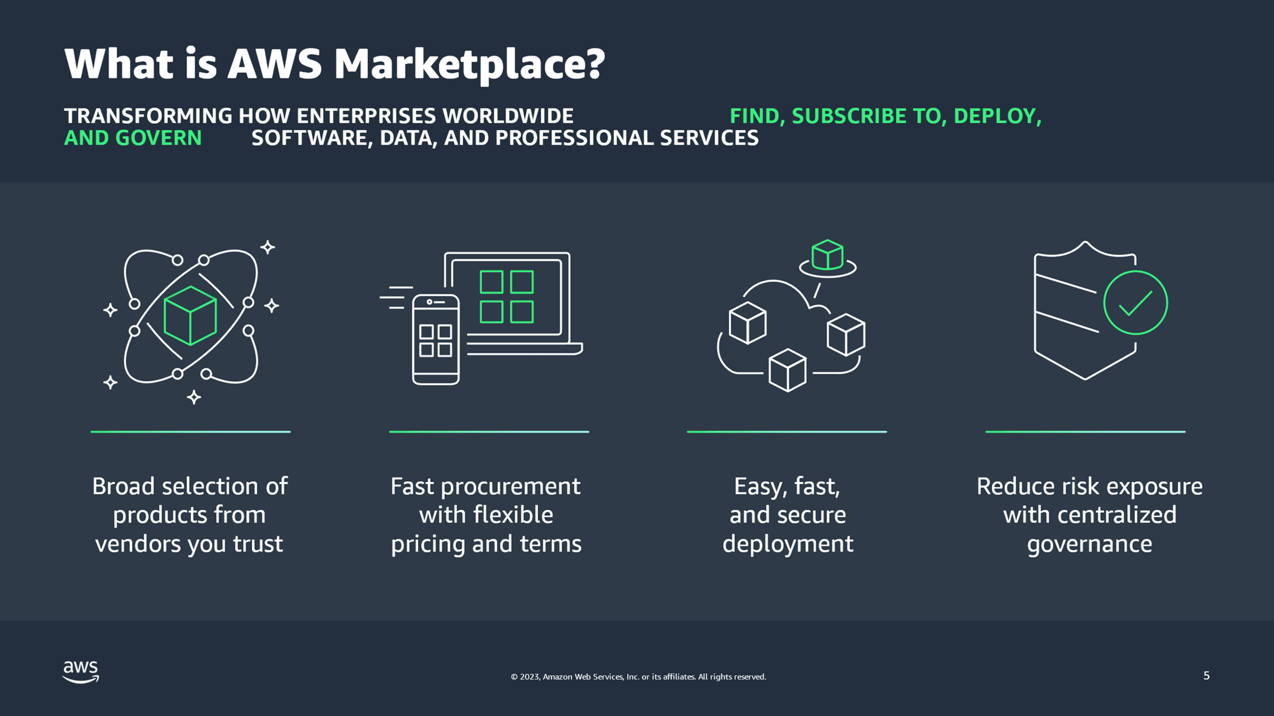 The underlying reasons why AWS customers adopt marketplaces are shifting too. It's no longer just about using their committed cloud spend to buy via AWS Marketplace. Many customers are turning to AWS Marketplace as part of their broader modernization strategy. AWS Marketplace helps customers accelerate and simplify procurement, improve governance and control, and optimize software spend with features including custom pricing and agreements, cost management tools, Private Marketplaces, and Vendor Insights.