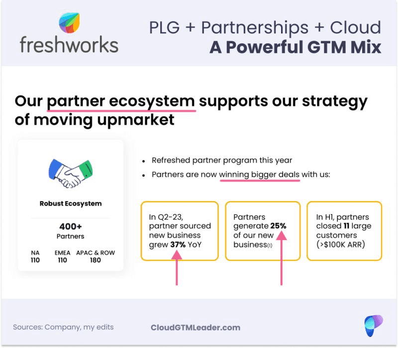 Freshworks' transition from a PLG model to experiencing 2X growth rate in partner-sourced ARR (vs direct sales) while also co-selling with AWS, is a prime example. Let's examine it.