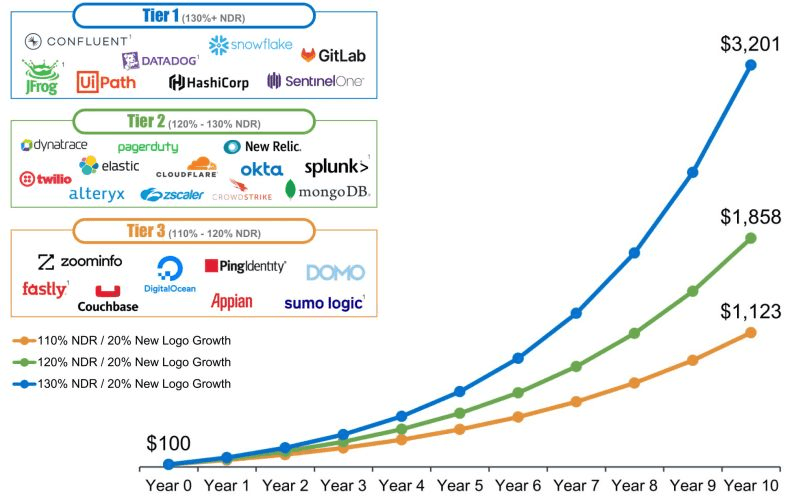 Tier 1 companies that have 20% higher NDR have 📈 3X LTV - see the graph (logo growth equalized b/w cohorts)