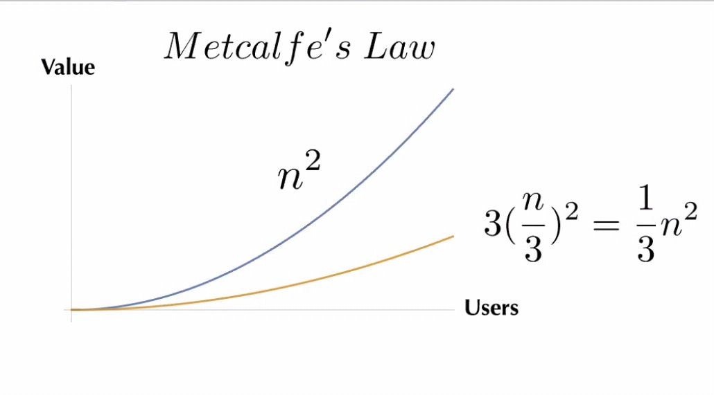 Well, then you take one-third over N, you square it, you get one-ninth, multiply it back by three, because you've got three companies, but you've only got one-third the value. So you've got an N squared not going up like this, but going up like this [less steep], and you're not getting the benefits of the network effects. You're spreading value over smaller pools of users, which is a bad idea. Breakup isn't the right way to ask a question. So it wasn't competition, we should've focused on, it's creating value that we should've focused on. So that brings us to a different question.