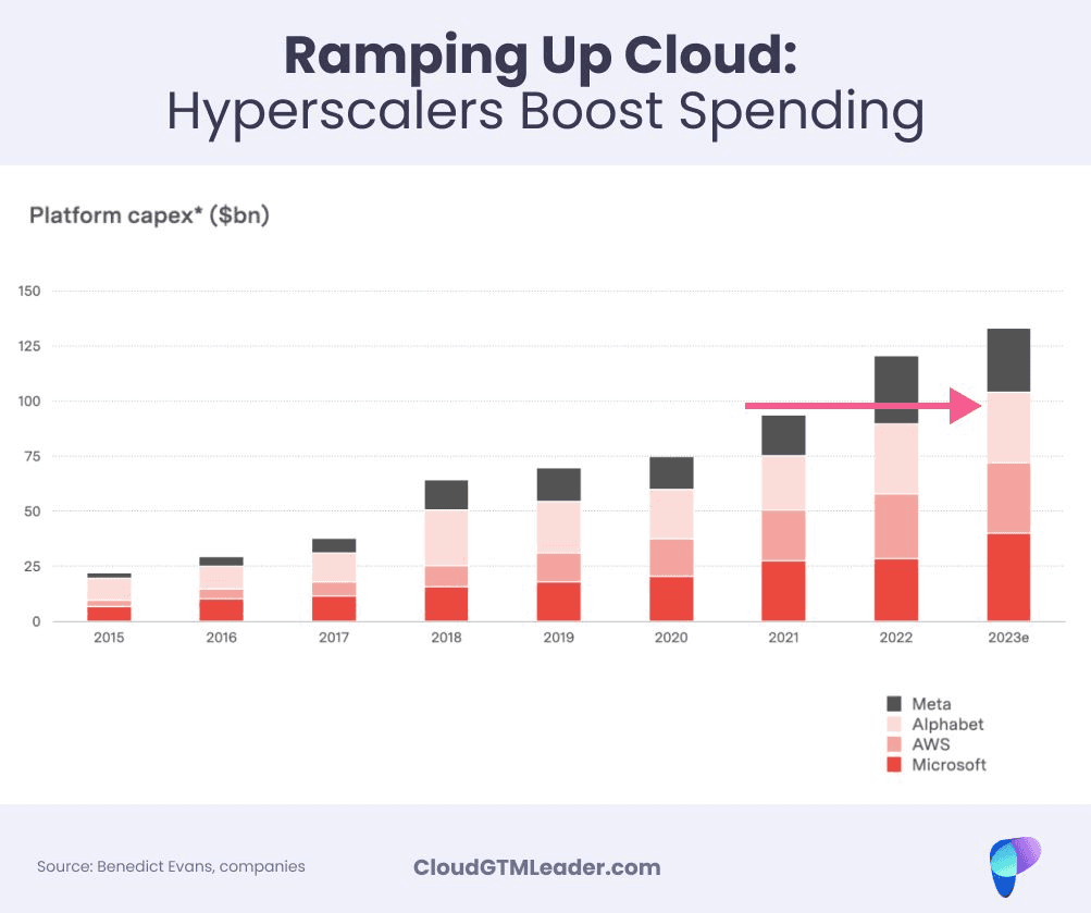 The commitment of Amazon Web Services (AWS), Microsoft, and Google to scaling the cloud is underscored by their substantial infrastructure investments. Tech analyst Benedict Evans notes that the top three hyperscalers' infrastructure spending in 2023 is estimated at a staggering $100 billion, approximately double their annual spend five years ago.