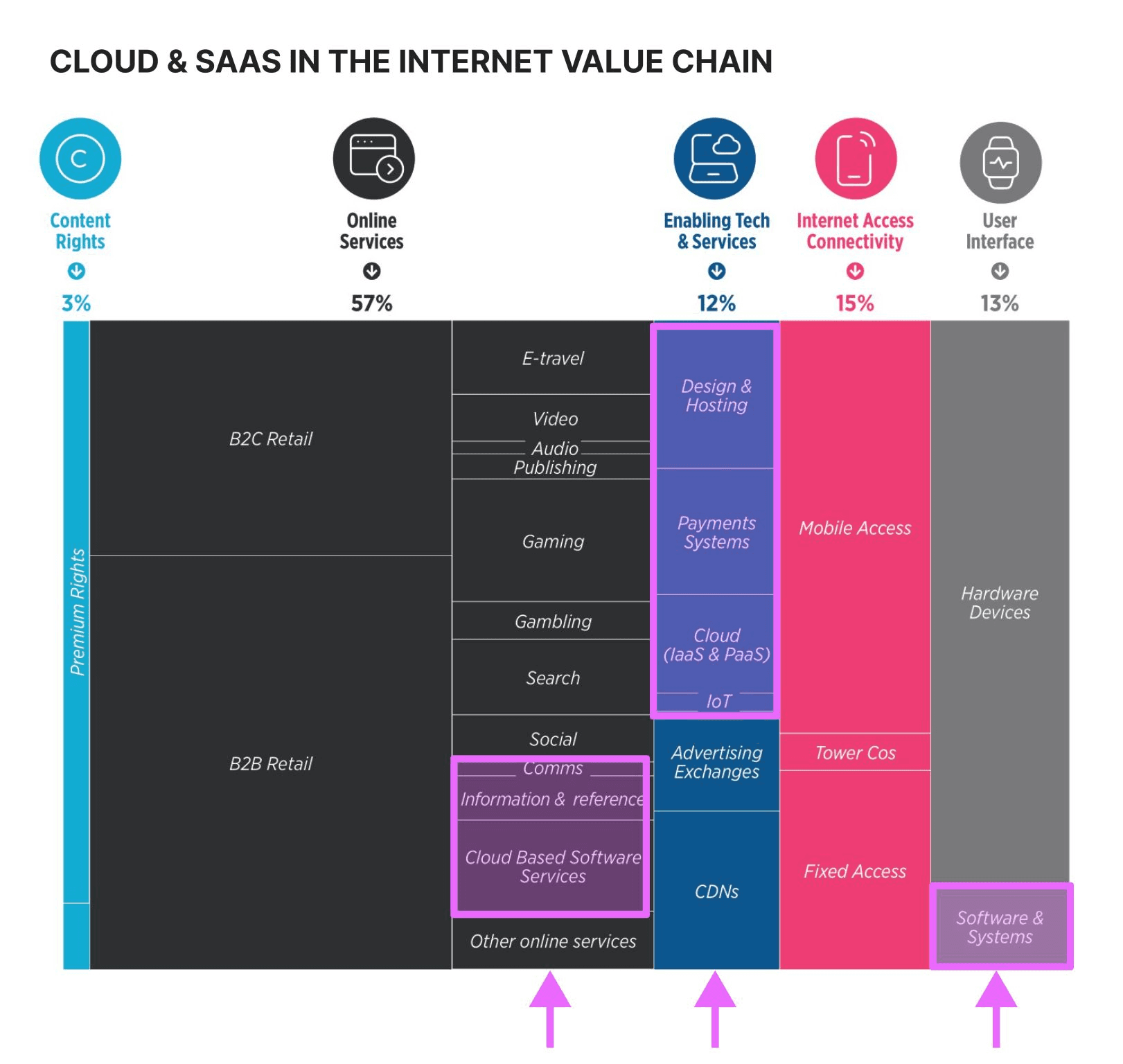 The largest technology players - think Amazon, Microsoft, Google, etc. - are expanding their footprints across the value chain.They’re launching new services and using their scale and existing customer bases to drive success in new segments.[e.g. the rise of their cloud marketplaces - take a look at our take - link in the end]They are also integrating along the value chain, buying up content rights players and enabling technologies, and investing in end-user devices.#Superapps - think WeChat, probably soon Twitter - are taking a similar direction of integrated platforms and ecosystems connecting users to many services.💰 Internet value chain had global revenue of $6.7 Tr (2020).This graph was built in ‘22 based on ‘20 data. Since then the market grew ~10% as the number of internet users increased from 4.6 Bn to 5.16 Bn in 2023. Segments like #cloud are changing faster than others. Collectively global end-user spend on public cloud services is predicted to reach $591.8 billion in 2023 (Gartner).☁️ In big picture, B2B and B2C online services and Enabling Tech stack takes ~70% of the entire value chain.SaaS and cloud segments highlighted on the map:✔️ Cloud-based software servicesB2B: SaaS, like Xero or SalesforceB2C: SaaS, like Google Drive, Office 365, etc.✔️ Communication and collaboration services, includesB2B: Slack and Microsoft Teams inB2C: WhatsApp, Signal, Telegram and WeChat in✔️ Cloud-based infrastructure and platform servicesMicrosoft Azure, Google Cloud Platform, AWS, Alibaba✔️ Online payment gateways and e-wallets include PayPal, Paytm and Stripe✔️ Systems and softwareInclude VPN, anti-virus software, as well as professional-grade B2B endpoint and network security by Cisco, VMware, Juniper, etc.